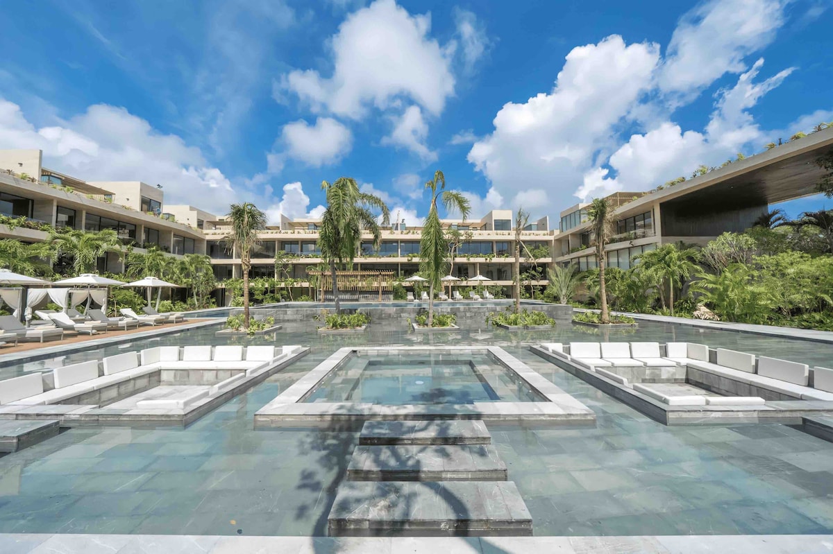 Surrounded by lush palms, this unique accommodation offers the perfect blend of comfort and convenience. Located just 7 minutes from the beach, La Veleta, and 10 minutes to downtown, you’ll have easy access to everything Tulum has to offer. Enjoy one of the largest pools in Tulum, a free beach shuttle, and a fully equipped gym. The complex also features a spa, on-site restaurants, and a convenience store. We have everything you need for a seamless and relaxing stay.