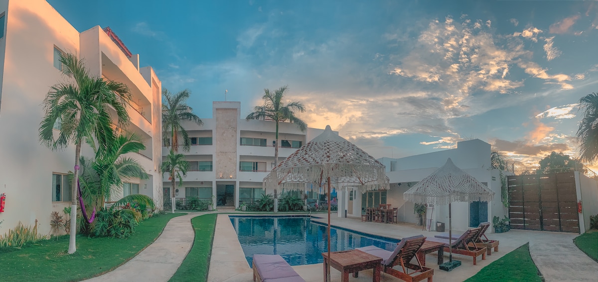 Jungle Oasis Loft w/ Private Plunge Pool & Terrace! Escape to this stylish 2nd-floor loft with a private terrace & plunge pool overlooking lush jungle views! Enjoy free bikes during your stay, a fully equipped kitchenette, and 24/7 security for peace of mind. Designed for couples, solo travelers & digital nomads, this modern retreat is cozy,quiet,and surrounded by nature just 15 min from the beach & downtown! Relax in your kingsize bed, dip in your pool,or explore nearby cenotes,beaches & more!
