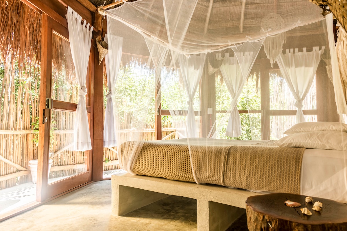 10-15 MIN DRIVE FROM Tulum Town! This Treehouse Glamping Experience in the jungle is for nature-lovers and adventurers or for a unique experience. You stay in a private & unique Ecological Tree House. Nested in the trees, a spacious treehouse dome will give you all comfort of Glamping: - King size bed - private bathroom - HIGH speed FAN. If you want to be in nature, close to cenotes but still have easy access to the town, this is for you.