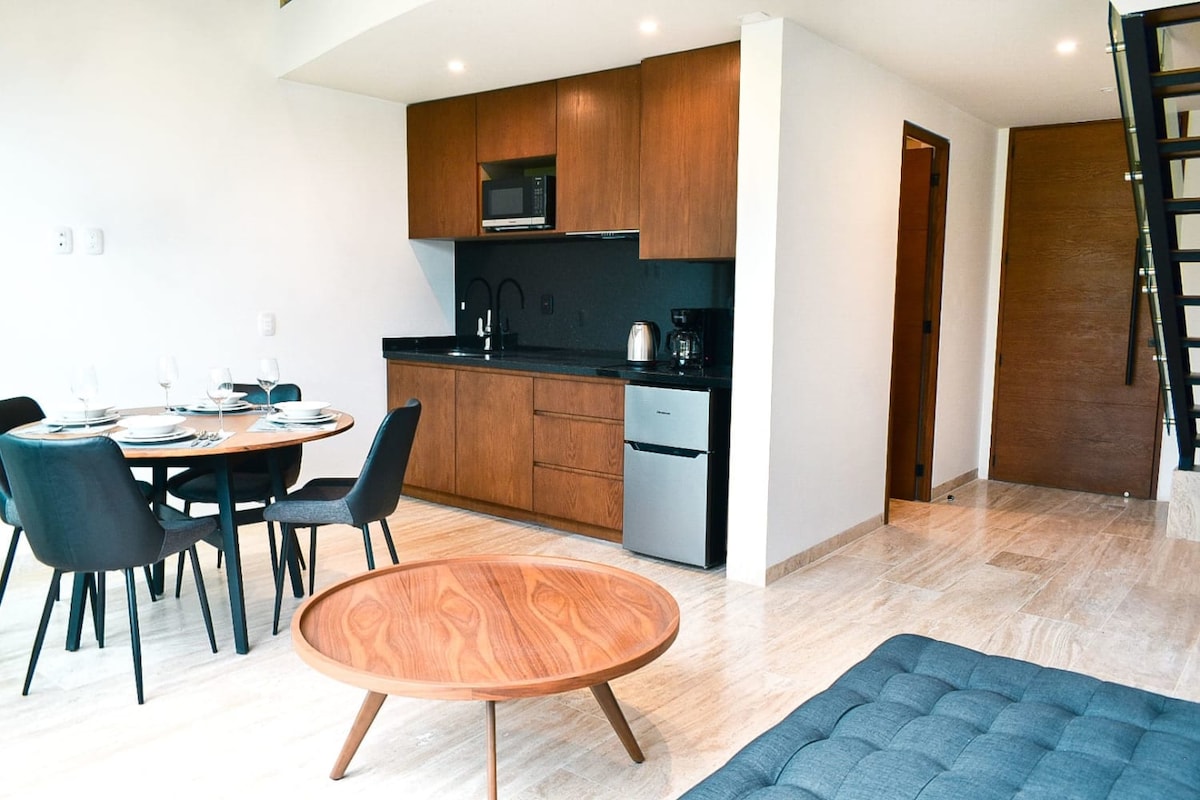 Our apartment is based in a brand-new residential development in one of the best neighborhoods of Tulum. Located close to everything you need, the development has multiple common areas specially designed for living in a natural environment with all the city amenities. With an incredible rooftop to enjoy with family and friends, you will be close to downtown and the best beaches in a quiet and safe place that allows you to rest and work in paradise.