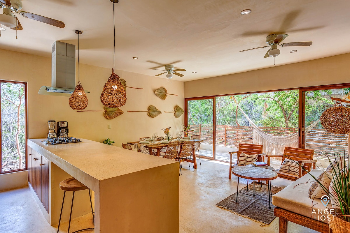 - Nature-inspired condo in a tranquil jungle development with a mystical vibe! - Enchanting surroundings with lounge spaces, pools & two unique cenotes - Amenities: co-working, gym, yoga loft onsite & just 8-min drive to town - Private balcony, lush views & private rooftop with dining, plunge pool & grill - FiberOptic Wi-Fi, laptop workspace, washer, dryer, and free parking
