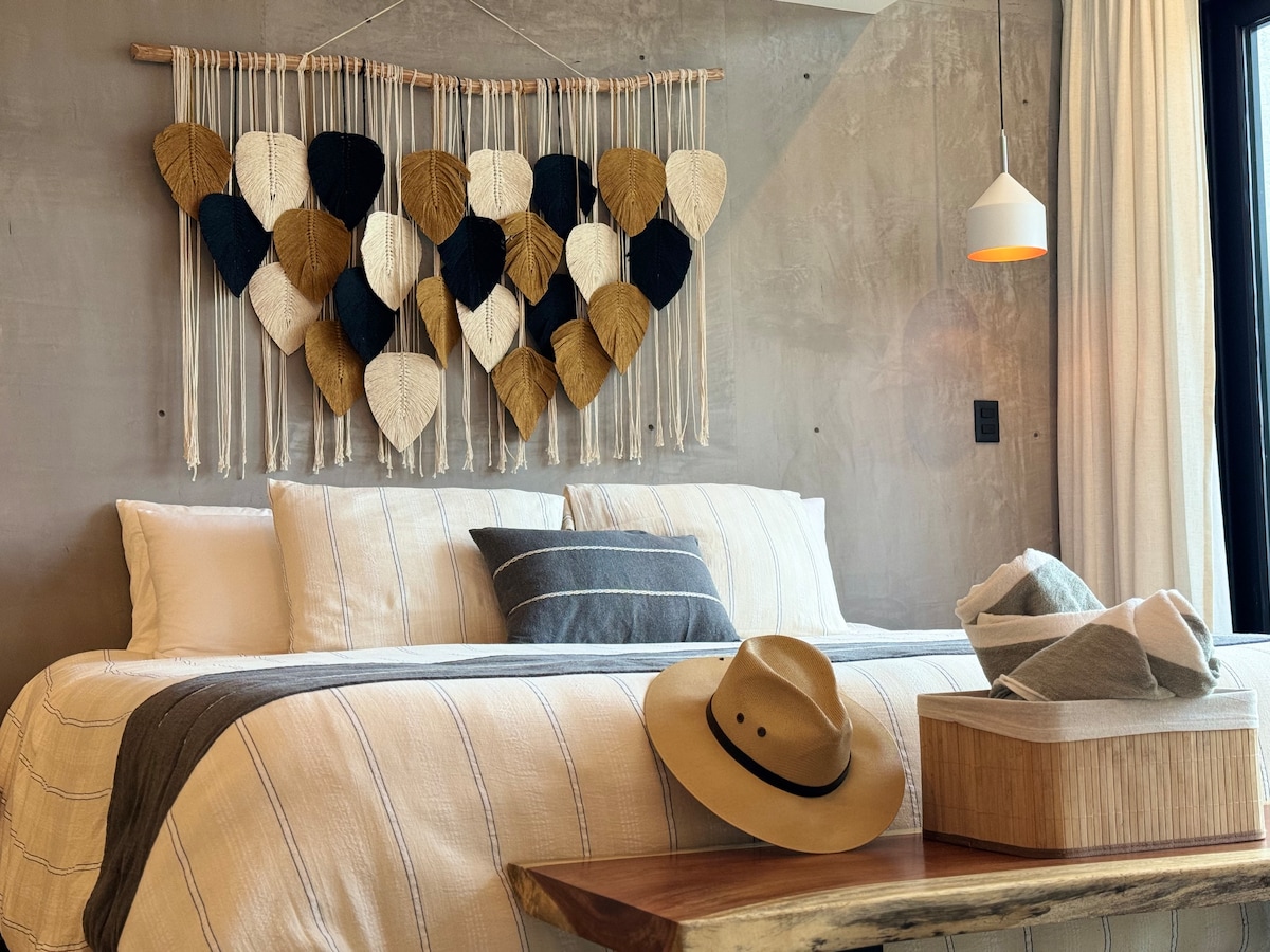 Luxurious and modern design suite located in the magical town of Tulum just a few minutes away from downtown. Enjoy our rooftop pool with amazing sunset views, surrounded by cozy gardens while you find comfort in WiFi, king-size bed, kitchenette, AC. Our team will do everything to make sure your stay is memorable and blissful. *GYM and SPA access for additional cost *Furniture can be changed due to weather and use conditions