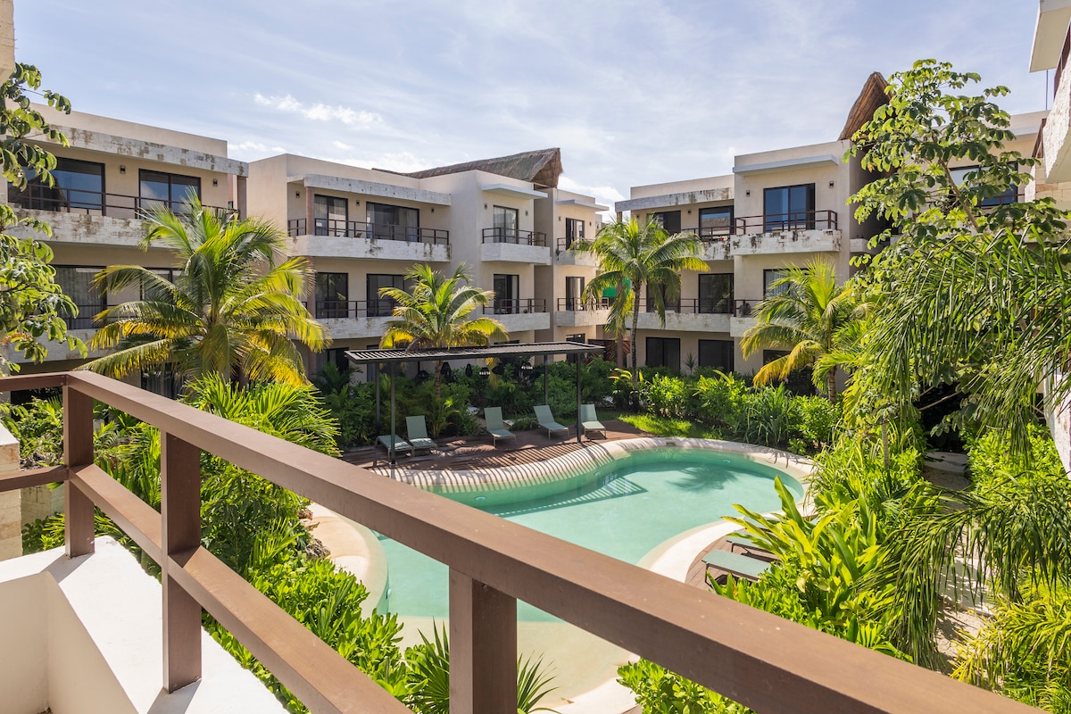 New & modern property located only 7 min. to the beach & walking distance to some of the best restaurants, shops and large supermarket. Everything you need for a great vacation. 2 free bikes, Fast internet, king bed, A/C, kitchenette,TV-Netflix; and access to incredible common areas (artificial cenote, jacuzzis, pool). Even your own private plunge pool & everything else you may need to make this your dream vacation.
