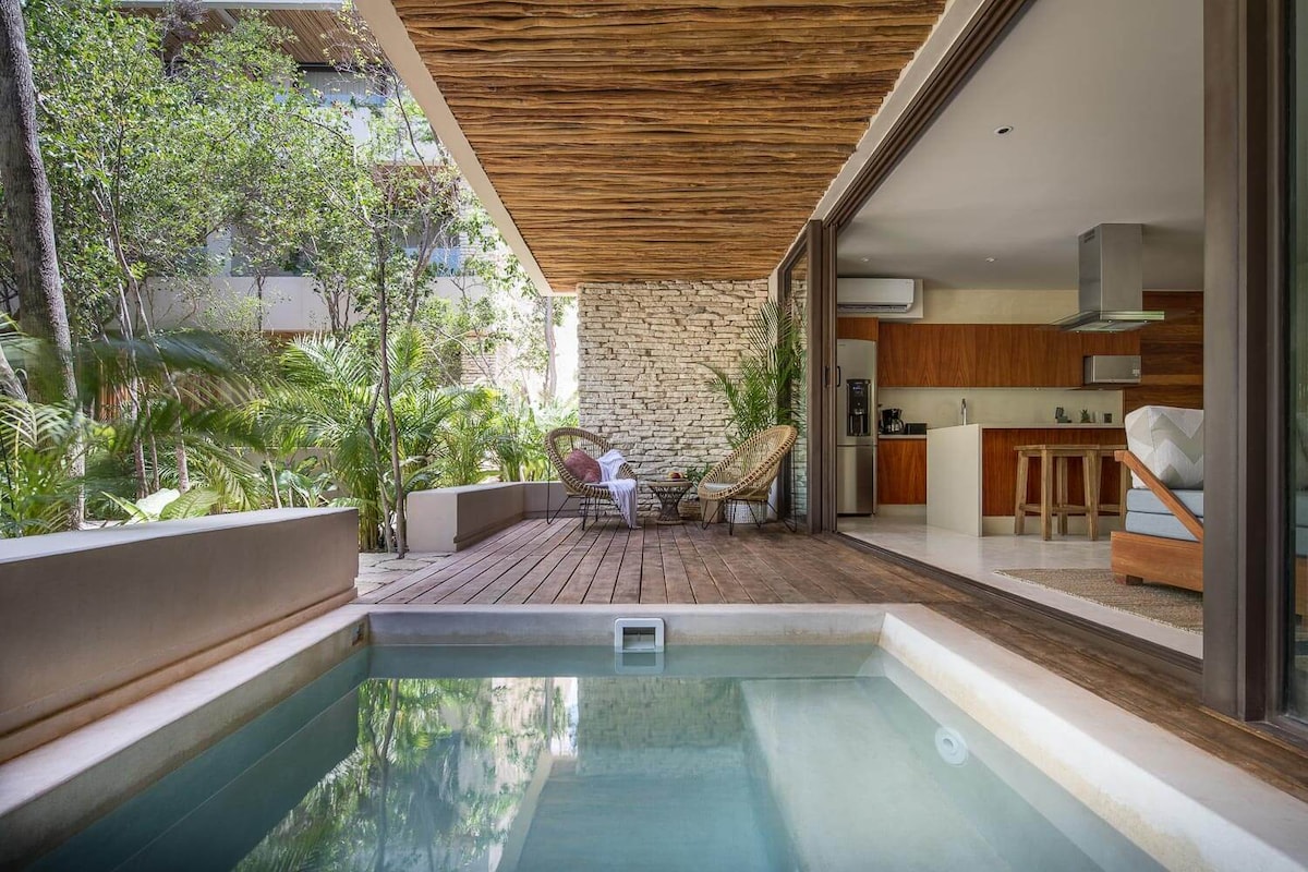 Beautiful & equipped 2 Bedroom Apartment / Private Jungle & Top Rated Restaurant On-Site. →Free Breakfast Monday to Saturday → On-site Coffee Shop / Restaurant → 2 Full Bedrooms with King Size Beds → Private Office → 2 Full Bathrooms. → Full Kitchen → Fiber Optic Wi-Fi (800 mbps) → Two 50'' Smart TV's with Premium International 4K Channels & Netflix → Cenote Water Pool w/ massage jets & wading Pool → Free Private Parking