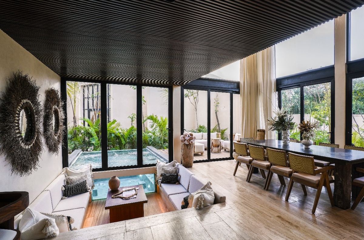 Luxury 2-story villa just 100m from Tulum Beach. Elegantly designed with a private pool, ground-floor bar, and a spacious living area. Living room featuring designer furnishings. 2 serene bedrooms with queen beds, soft cotton linens, and blackout curtains. Enjoy breathtaking jungle and sunset views from the terrace and rooftop with fully equipped kitchen, loungers and plush seating. your private oasis of style and tranquility.