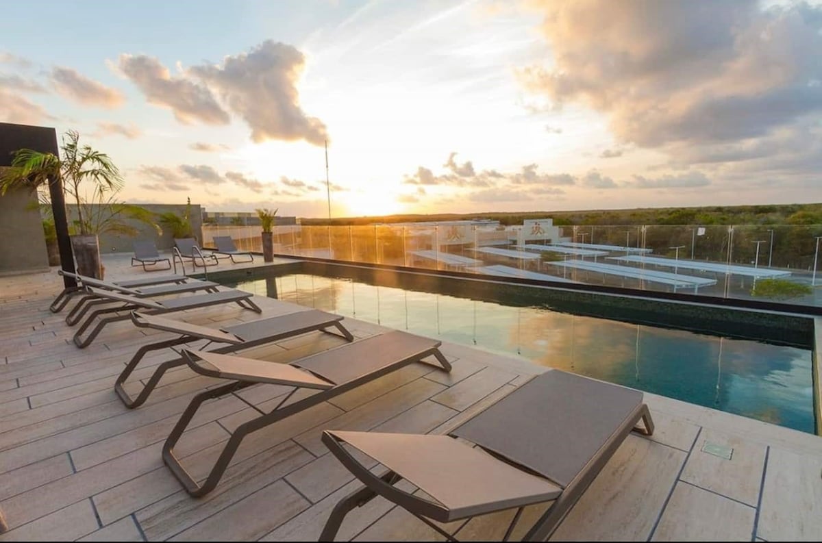 Fancy top-floor studio with unbeatable sunrise views over the forest canopy, true luxury and exclusivity. Near Tulum center and 10 minutes from spectacular beaches. Enjoy 2 huge swimming pools, jacuzzi, sun beds, a large gym, 24/7 staff, strong A/C, stable and fast Wifi (200 Mbps), blackout curtains, 55" smart TV and a perfectly equipped kitchen. Have dinner outdoors under the stars on the spacious private terrace with unparalleled views. The condo includes free shuttle to a beautiful beach club