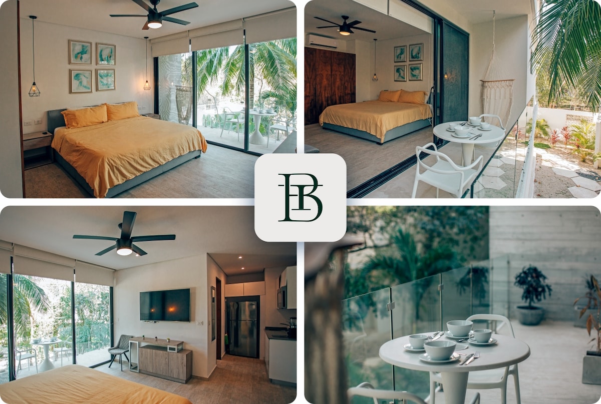 Welcome to this meticulously designed studio in vibrant Tulum Centro. Perfect for solo travelers or couples, it blends comfort, style, and convenience. Featuring a king-size bed, smart TV, a fully equipped kitchen, and a private balcony with garden views. Enjoy the rooftop pool, paddle tennis court, and access to vibrant art installations. Your reservation includes complimentary concierge service, and preferred access to some of the best beach clubs in Tulum.