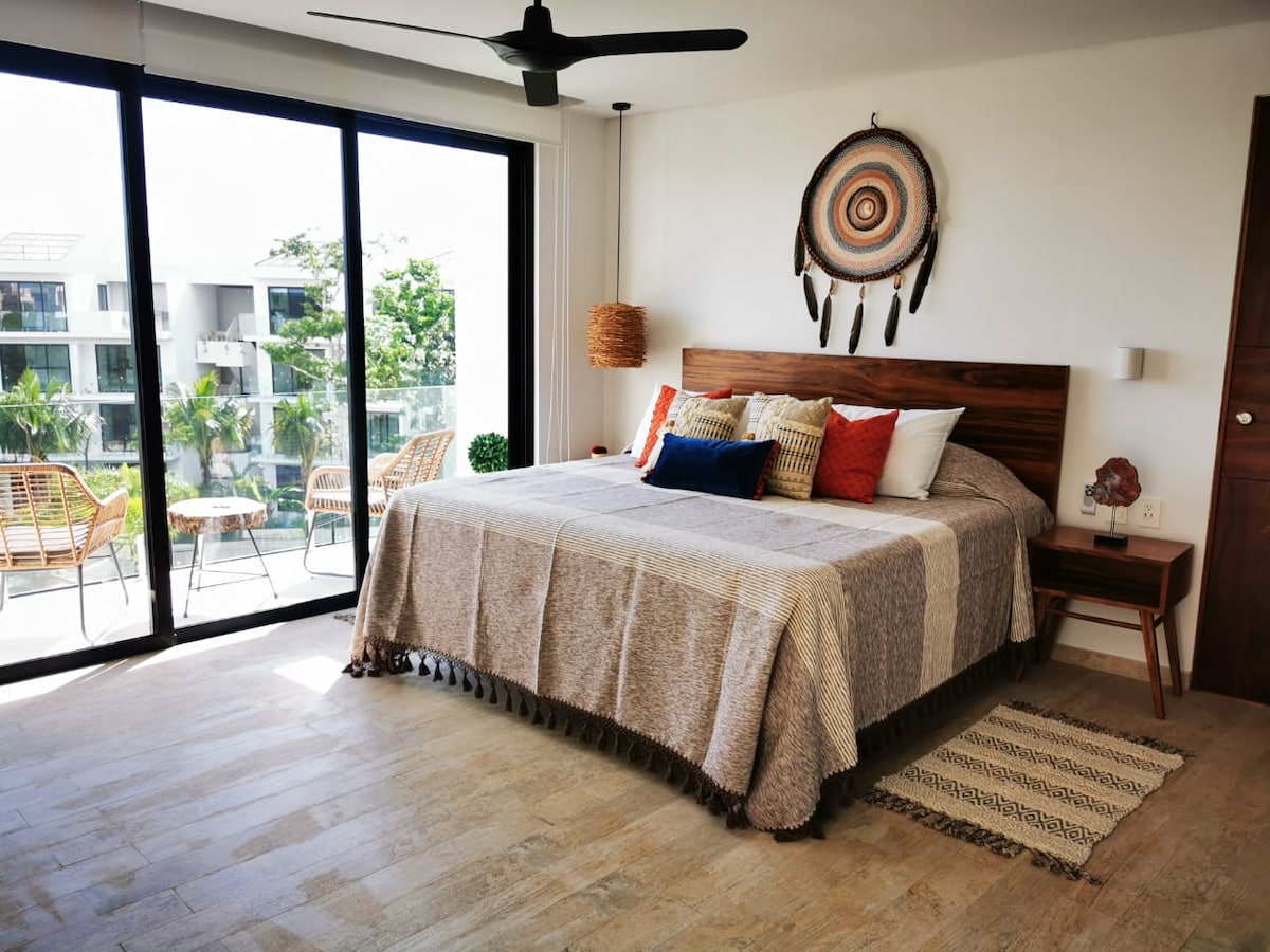 ❈ Amazing rooftop with infinity pool ❈ 2 Jacuzzis ❈ Sauna & Spa ❈Equipped gym ❈ Outdoor movie theater This one-bedroom apartment within Aldea Zama has a privileged location. It is located inside a new residential complex where you will have the best vacation in Tulum. You will have at your disposal excellent amenities, free parking, high-speed Wi-Fi, a private terrace, and all the essential equipment to enjoy your stay in this cozy space.