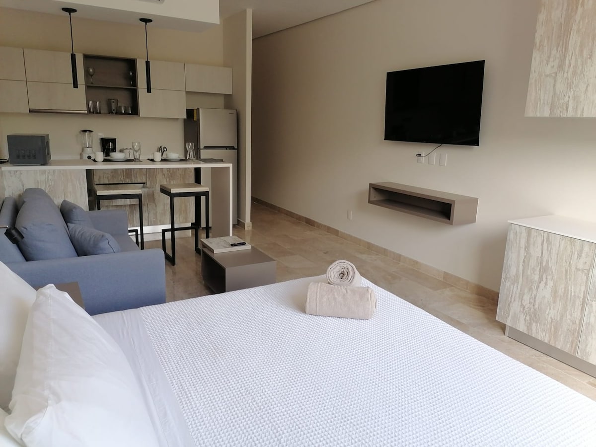 Loft-style studio, with a contemporary design, perfect for traveling alone or in couples. Located in the exclusive Aldea Zamá Premium area, only 8 minutes from Chedraui, 10 minutes from downtown Tulum and the beach by car. It has different amenities for the enjoyment of guests: a rooftop where great sunsets can be appreciated, Yoga and Gym area, cinema and Temazcal for entertainment and relaxation; For work trips, there is a Co-working area and a meeting room.