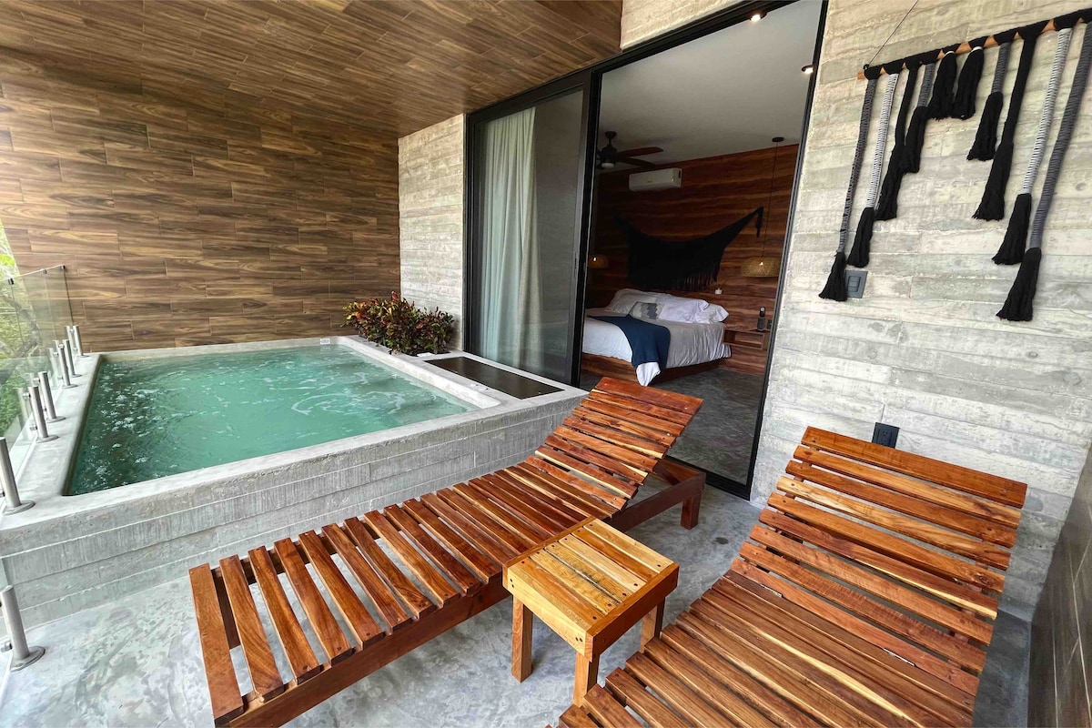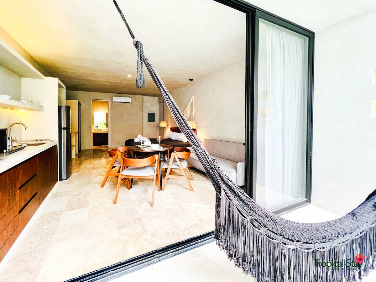 Welcome to Aflora Tulum – Your Jungle Escape with Modern Comforts Nestled in the heart of the lush Tulum jungle, Aflora is a beautifully designed one-bedroom loft that blends tropical tranquility with contemporary style. This serene retreat features a full bathroom, a fully equipped kitchen, and a dedicated coworking space—perfect for remote workers and digital nomads. Step outside your door and enjoy full access to the stunning resort-style pool and gym.