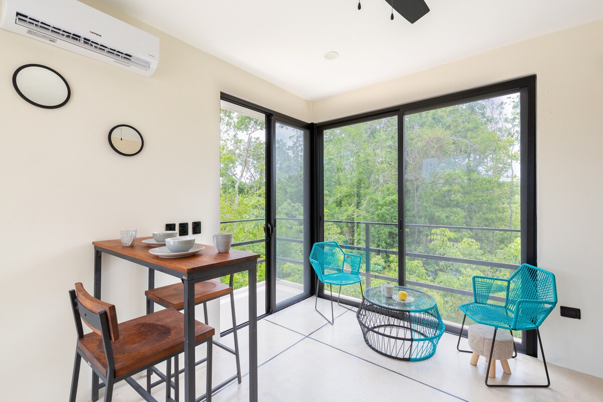 Welcome to Aflora Tulum – Your Jungle Escape with Modern Comforts Nestled in the heart of the lush Tulum jungle, Aflora is a beautifully designed one-bedroom loft that blends tropical tranquility with contemporary style. This serene retreat features a full bathroom, a fully equipped kitchen, and a dedicated coworking space—perfect for remote workers and digital nomads. Step outside your door and enjoy full access to the stunning resort-style pool and gym.