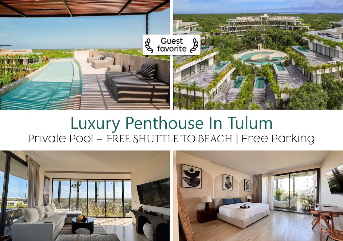 Luxury apartment in Aldea Zama. 7 min drive to beach, 5 min drive to Tulum Centro, walking distance to restaurants and shops in Aldea Zama. Local and high end furniture throughout creates a clean and artistic environment. Private pool and underground parking. Two free bikes. Your own theatre lowers from the ceiling with the click of a button. Fully outfitted kitchen, TVs, Games. You won't even need to leave.