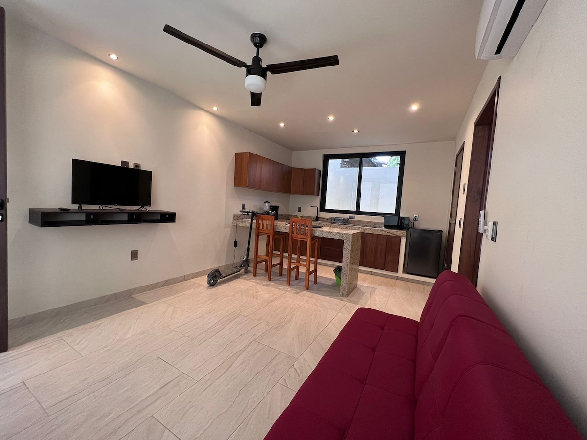 A combination of Italian and Tulun design: dreamy and tropical common area with 2 beautiful pools to chill and unwind peacefully while getting a so longed for Caribbean tan. This comfortable and fully equipped Apartment, a lovely nest to come home to after a long and adventurous day on the beach has everything you might need for a relaxed stay: AC, ceiling fans, WIFI and comfy details all thoughtfully chosen for your most special time in Tulum. Relax and enjoy, we will take care of you! Welcome!