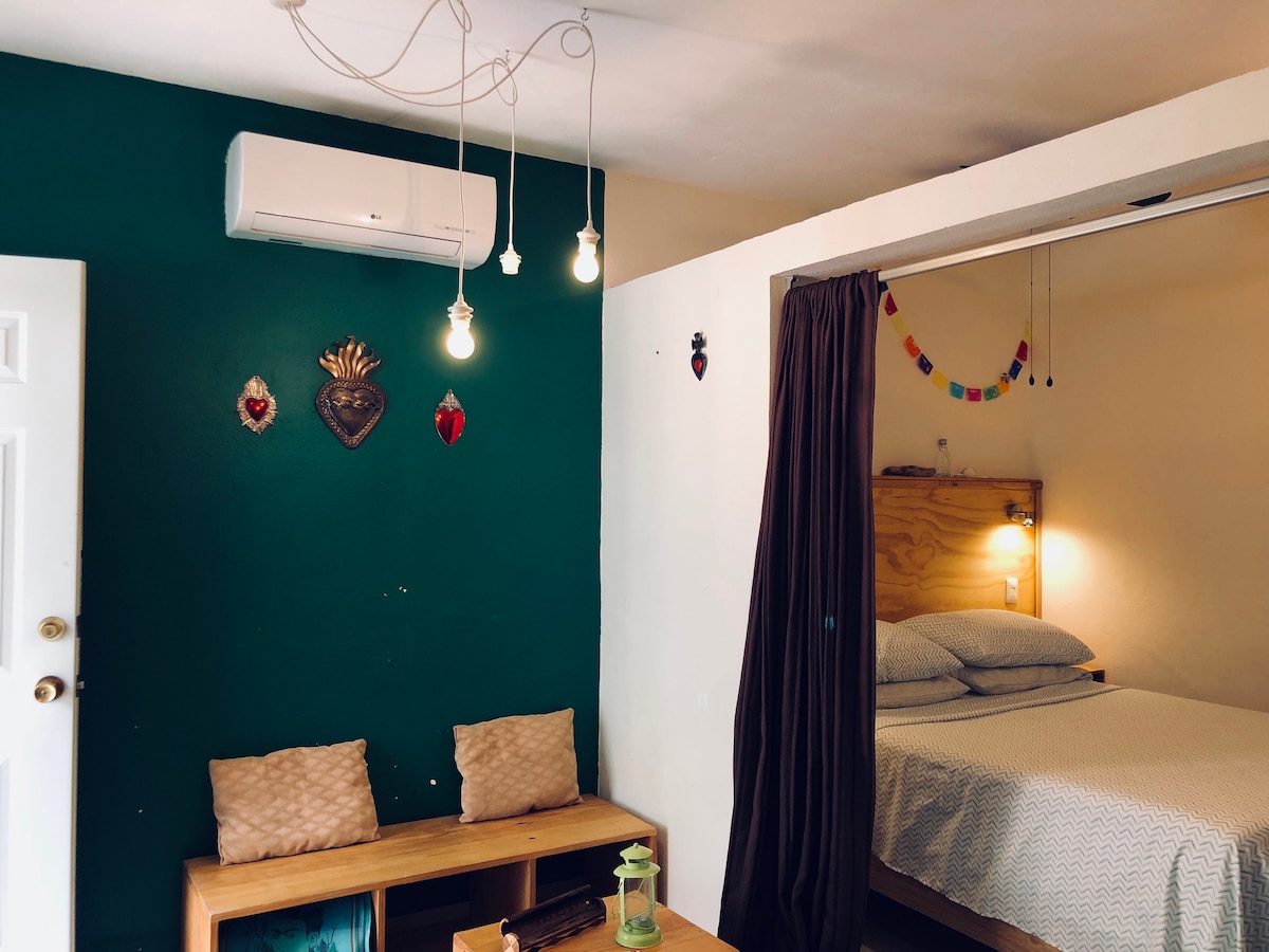 Your vacation home away from home; ideal for couples, digital nomads or solo travelers. With fast internet, bedroom with king bed, A/C unit, kitchenette & balcony plunge pool. You will have access to incredible common areas such roof top pool, Jacuzzis, and much more. One of the most convenient locations you will be within walking distance to some of the best restaurants, shops and supermarket; and closeto the beach.. You will have everything you need to live the Tulum experience.