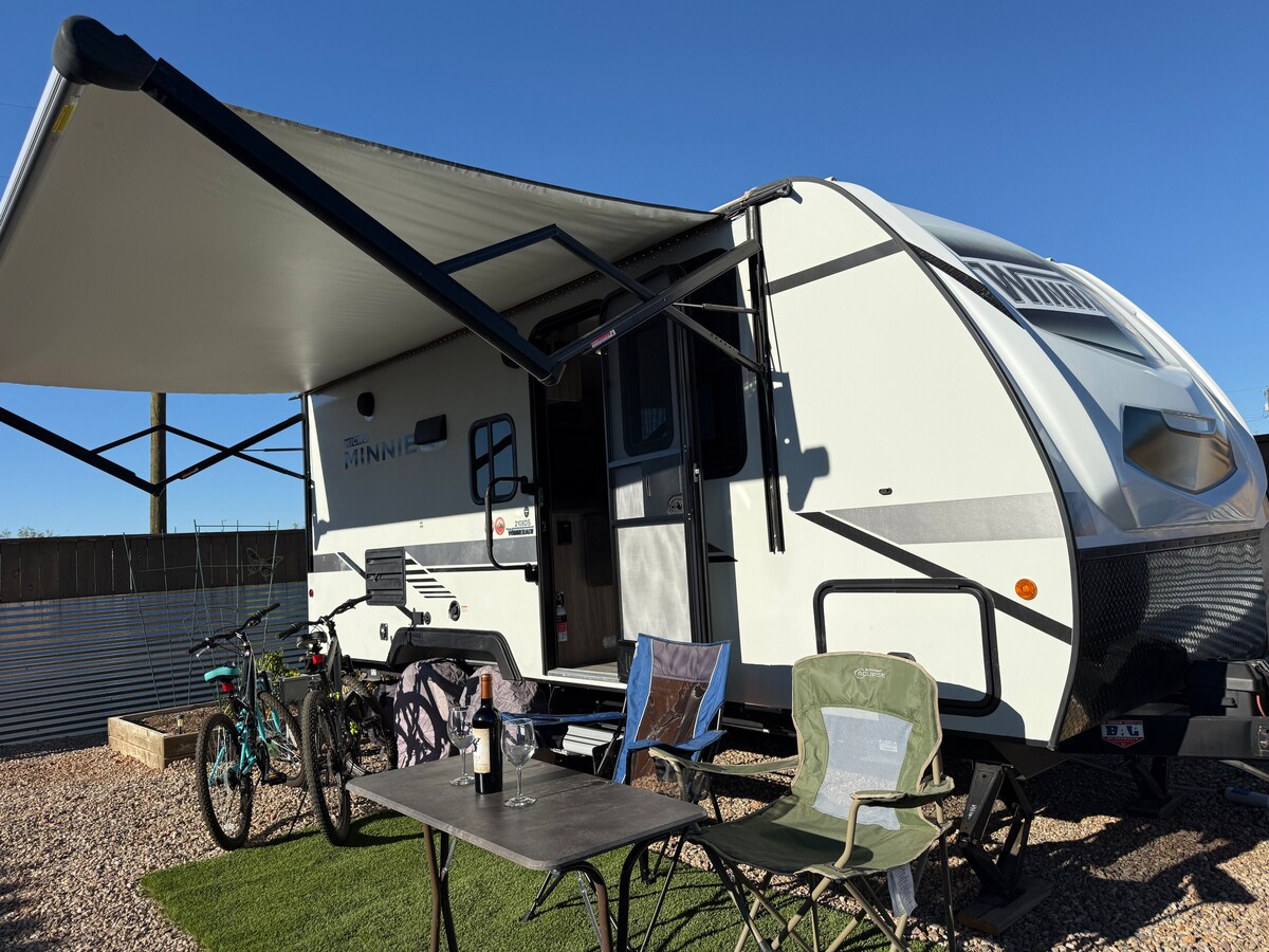 A tranquil, spacious, and beautiful Casita. Comfortable King bed with a gel memory foam mattress, additional pillows and blankets for your convenience, private bathroom, microwave, small fridge, toaster, coffee maker, and teas and coffee for a quick bite. Private entrance and a small patio with seating area, which leads to the staircase to the roof where you can enjoy the view during the day and the Milky Way at night. Large screen TV with Netflix and Hulu (bring your own passwords), and Wi-Fi.