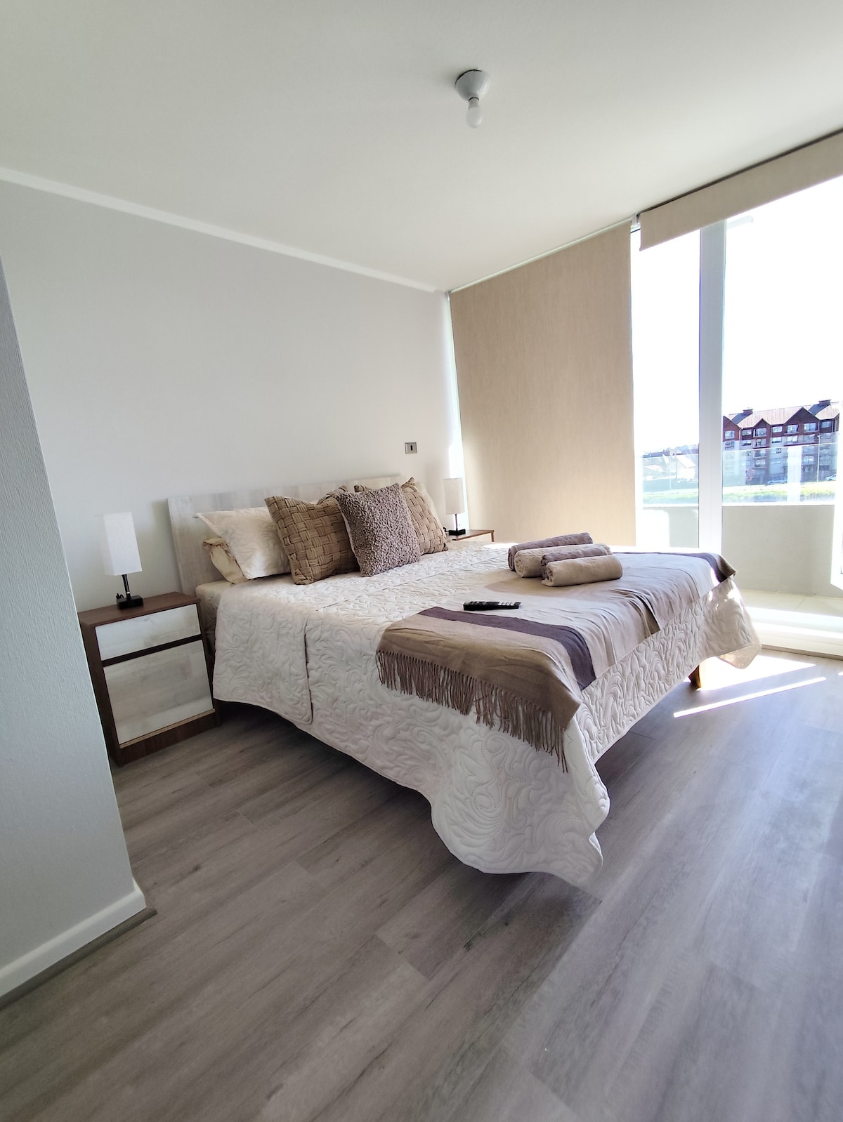 Departamento moderno en el centro de Talcahuano de 2 habitaciones y 2 baños (uno en suite con walk-in closet). Cuenta con terraza amplia, estacionamiento, wifi, agua caliente y lavadora. Totalmente equipado para una estadía cómoda. Distribución de camas: dormitorio principal con cama de 2 plazas; segundo dormitorio con dos camas de plaza y media, una de ellas tipo nido. Ideal para familias o grupos.