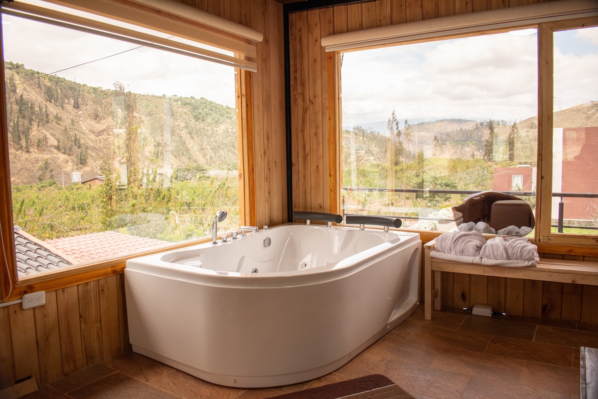 Este lugar único tiene su propio estilo. Hospedaje con hermosa vista y desayunos incluidos. Amplio espacio en dos habitaciones hasta para 5 personas. Habitación matrimonial + habitación doble. Jacuzzi exterior en el balcón. Contamos con restaurante propio en nuestro proyecto turístico, pueden cenar directamente en la habitación. Amplias zonas verdes para realizar caminatas. Estamos a 40 min desde Patate o 20 min desde Baños. Tina de baño en la habitación. Decoración Romántica o de cumpleaños :)
