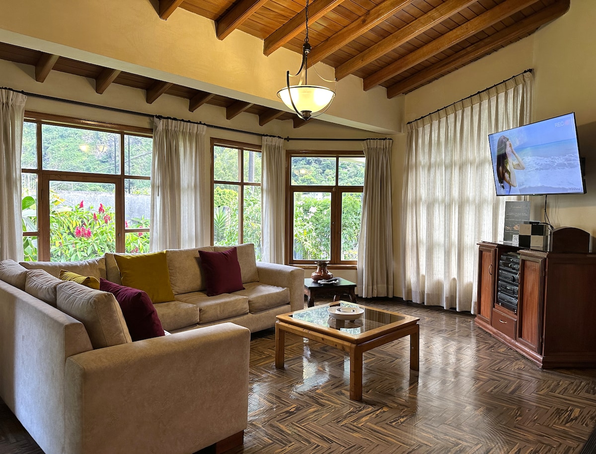 Este Suite independiente es un espacio único: combina confort de 5 estrellas con cama queen, muebles de diseño y aparatos modernos con un patio verde enorme donde puedes relajarte en plena naturaleza. En el huerto puedes cosechar tus propias frutas y vegetales orgánicos (incluyendo café :-). Es ideal para parejas, tal vez con 1 niño (para bebe hay cuna). A las cascadas caminas en 5 min. y al centro llegas en 10 min. en carro. Puedes parquearlo al lado del Suite, con enchufe para carro eléctrico