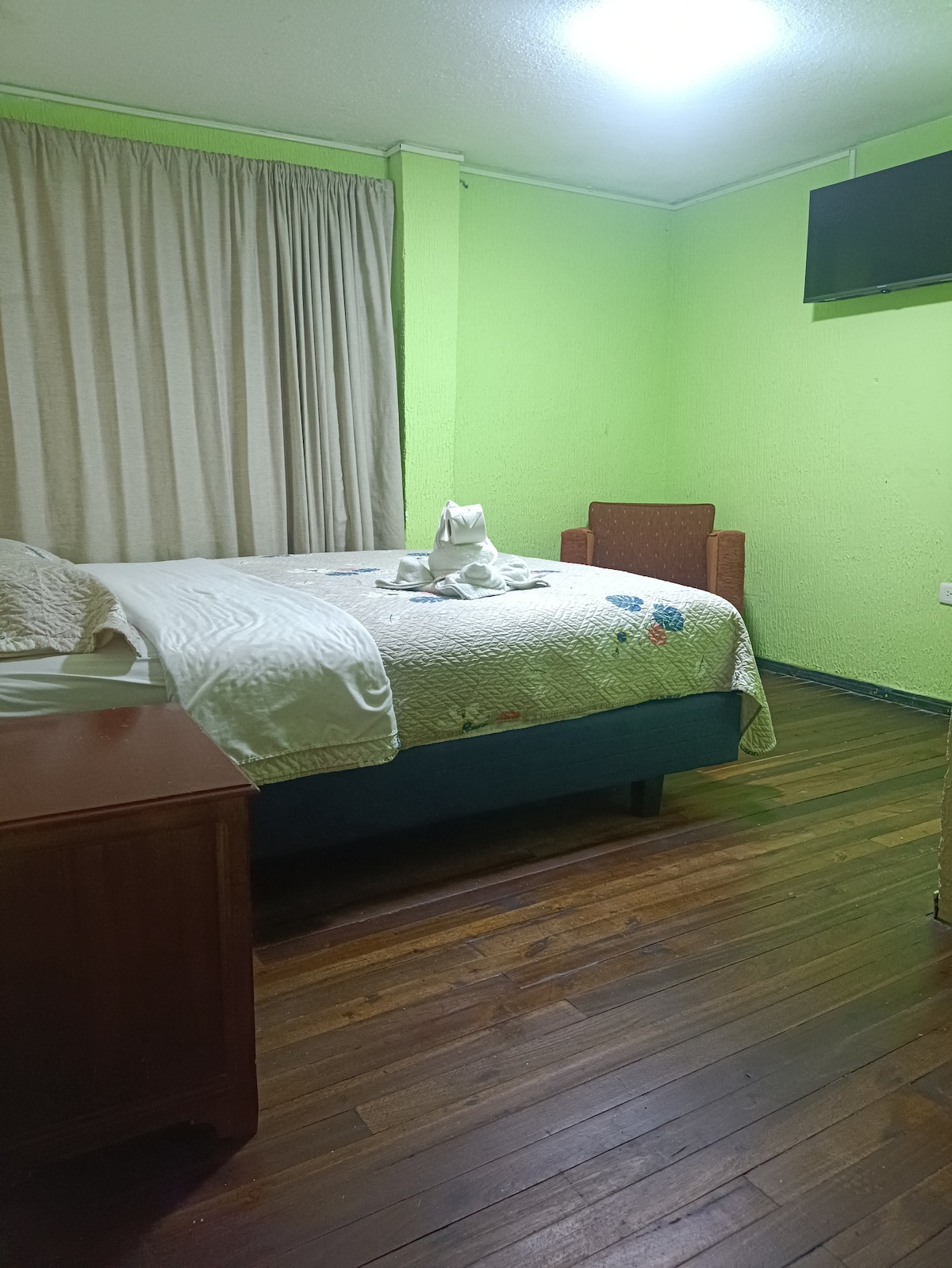 Habitación cuadruple ubicada en el centro de Baños de agua Santa muy cerca a restaurantes, tiendas, operadoras turisticas. La habitación cuenta con una cama doble y 2 camas de sencillas con baño privado.