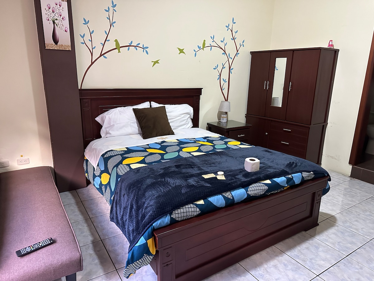 Nuestra habitación individual está diseñada para brindar comodidad y descanso a quienes viajan solos a Baños de Agua Santa. Cuenta con una cama confortable, baño privado con agua caliente, televisión por cable y conexión Wi-Fi gratuita, ideales para una estadía práctica y agradable. El hotel dispone de garaje para mayor seguridad, ofreciendo a nuestros huéspedes un ambiente tranquilo y funcional durante su visita.