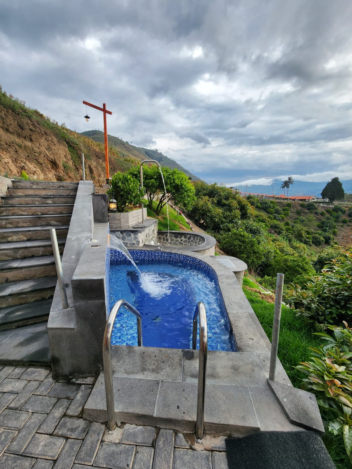 Es una casa cabaña, ubicada a 7 minutos del centro de Baños ,lleno de áreas verdes y jardines ,orquídeas y diversidad de aves , rodeada de montañas y una vista impresionante a la cuenca del rio Pastaza , única para el descanso y el relax familiar. Adicional para su conocimiento necesitan subir 38 escalones de cemento y piedra rústica , al final tendrán la recompensa de la magnífica vista al río Pastaza desde lo alto y su recién inaugurada hidropiscina de agua temperada.