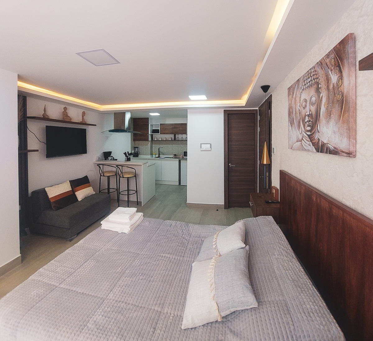 Suite Zen en Baños de Agua Santa: lujo y confort en un edificio moderno, seguro e inteligente. Disfruta de jacuzzi y sauna, jardín Zen Shu para meditación, área de fogatas y BBQ. Cuenta con ascensor y parqueo. Ubicada cerca del centro de Baños, cascadas, termas y miradores icónicos, es el refugio ideal para vivir una experiencia exclusiva rodeado de naturaleza y tranquilidad. Para tu estancia, contamos con 1 cama queen size, 1 sofá cama de 1 plaza y media, 2 TV de 55",cocina, microondas, nevera