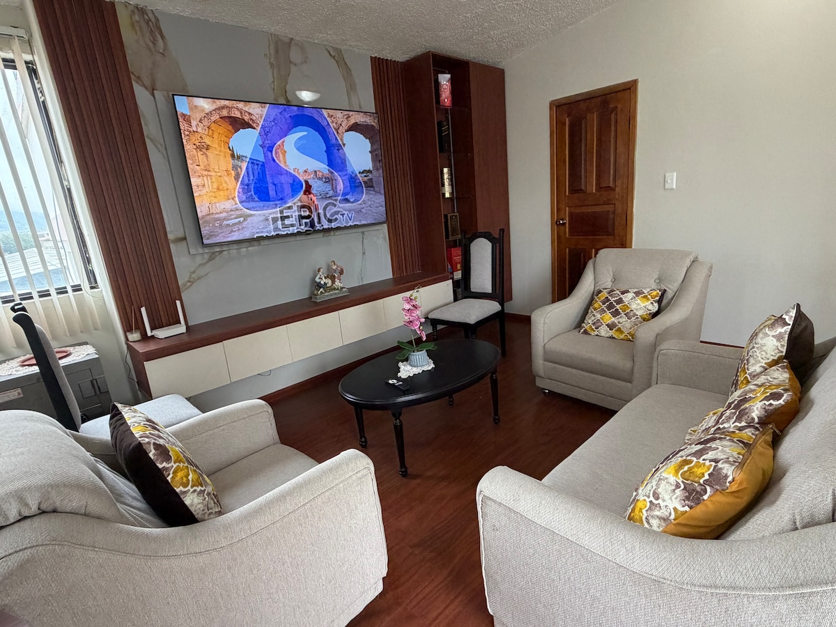 Vive experiencias inolvidables con tu familia o grupo de amigos en este apartamento muy elegante, moderno y con gran estilo. Ubicado en 3er piso, totalmente amoblado, con vista panorámica a la ciudad y montañas; cómodo en zona céntrica y muy segura. Tiene sala, smartv, comedor, cocina, baño social, 3 dormitorios, 2 baños completos, 2 balcones, acceso a la terraza. Wi-Fi, internet, agua caliente (24 horas) garaje automatizado privado para 1 auto. Camas: 3 (2 Queen, 1 Full) Capacidad: 6 huéspedes.