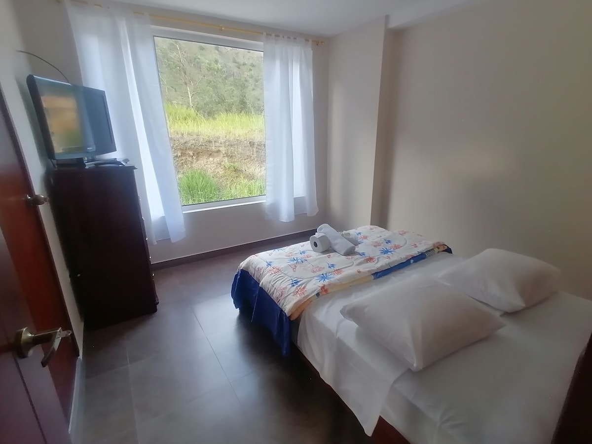 Departamento ubicado en el centro de Baños en una zona tranquila y confortable con una preciosa vista hacia las montañas cuenta con una habitación matrimonial y un sofá cama de 2 plazas también contamos con utensilios de cocina mini nevera microondas licuadora cafetera , wifi, televisión También si deseas venir con más familia contamos con otro departamento a lado con las misma características lo encontrarás en Airbnb cómo “ mini departamento hospedaje “