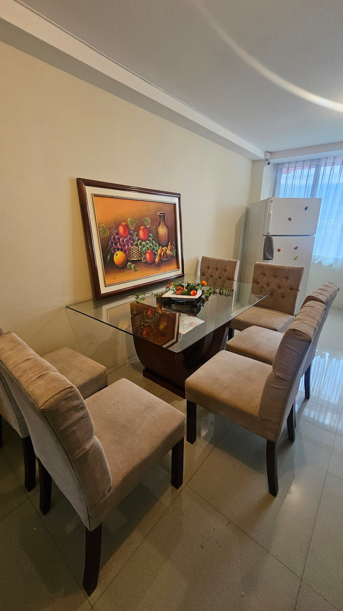 Complete spacious and very bright flat two blocks from Guaytambos Ave. It has two bedrooms with large closets, windows to the garden, and a two-seater bed in each bedroom. Fully equipped modern kitchen, a washing machine, a living room with a 50'' TV, a private garage, and an independent entrance. With a privileged location in Ficoa Las Palmas, you will be able to rest in a place with little traffic, very close to markets, shops, and the places with the best gastronomy in Ambato.