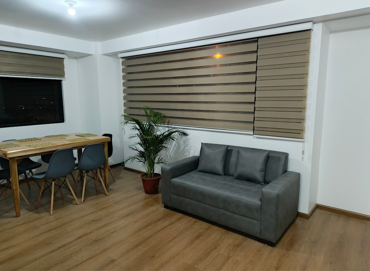 Un lugar elegante y acogedor ideal para para reconectarse y descansar solo o en familia; el departamento cuenta con una hermosa vista al Río Ambato, habitaciones con excelente iluminación, camas cómodas y una cocina equipada. Un espacio completamente nuevo por estrenar, ubicado en un lugar estratégico de Ambato a cinco minutos del centro de la ciudad y a diez minutos del sector industrial, una zona sin cortes de energía lo cual facilita tu comodidad, red WiFi, agua caliente, TV, parqueadero.