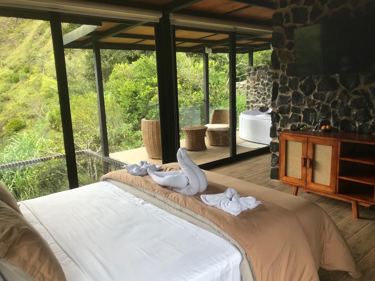 Give yourself the opportunity to stay at Villa Veleta: • Unobstructed views of the volcano and La Virgen Waterfall | From the bedroom | From the jacuzzi • Outdoor jacuzzi, central to the experience | Private • Architecture as the cornerstone: layout, views, materiality, and use resolved as one • Defined architectural language | No isolated gestures • King-size bed | Elevated rest • Close to everything • Discover Baños | The official guide to Baños | The team behind it, at your disposal