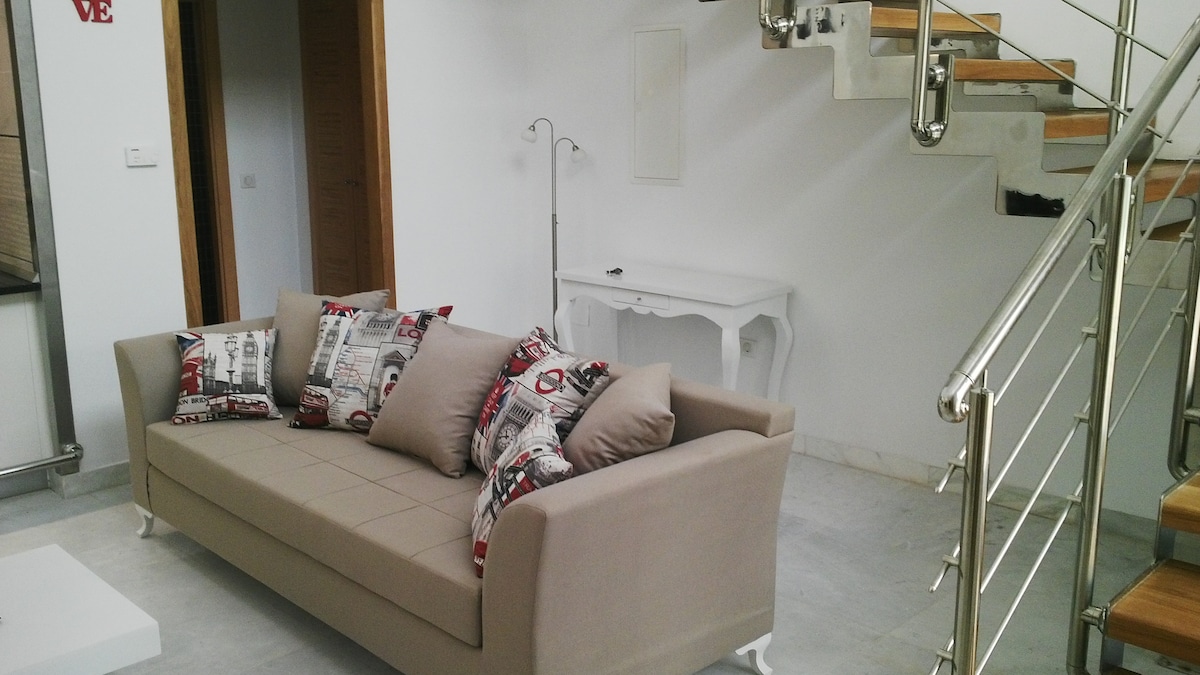 Le duplex est sur 2 étages, dans un quartier résidentiel de La Marsa ville. Il est luxueux, lumineux, avec 2 cuisines, 2 chambres avec balcon et 2 salles de bains et une terrasse, Il n’est adapté pour un couple avec enfant de moins de 5 ans. À 15 minutes de l’aéroport de Tunis , 10 minutes à pied de la plage ou à 3 minutes en voiture. Vous pourrez vous promener dans les magasins et les restaurants situés à proximité.5 min en voiture du village de Sidi Bou Said et des sites archéologiques.