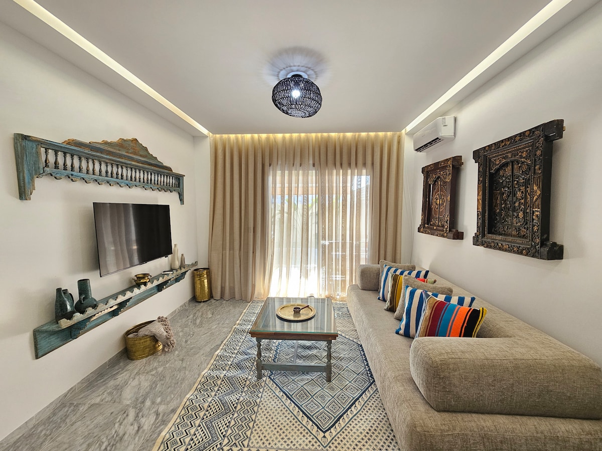 Appartement moderne avec salon lumineux et chambre confortable, décoré avec goût et entièrement équipé pour votre confort. Profitez d’une piscine élégante et privative dans un jardin agréable pour des moments de détente inoubliables. Situé à Ain Zaghouan Nord dans une zone résidentielle de haute qualité , à proximité des Berges du Lac et de La Marsa et à 10mn de 🛫 Il offre un emplacement idéal entre calme, loisirs et attractivité. L’endroit parfait pour allier repos, style et convivialité