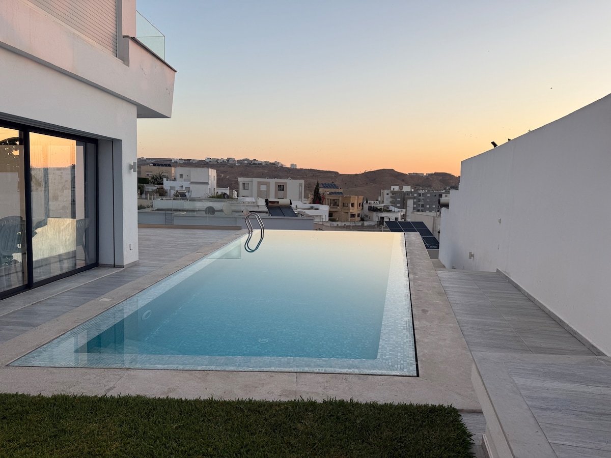 Villa avec piscine à débordement dans un beau quartier huppé de Tunis, proche de l'aéroport, du centre ville et des plages. Dès la porte d'entrée, vous êtes éblouis par la luminosité d'un superbe séjour, donnant directement sur la piscine. Toutes les chambres sont climatisées, équipées de toilettes et douche à l'italienne, avec dressing. La piscine, située plein sud, est réservée aux locataires. De l'étage, une vue à couper le souffle donne sur l'aéroport, la banlieue nord et le lac de Tunis.