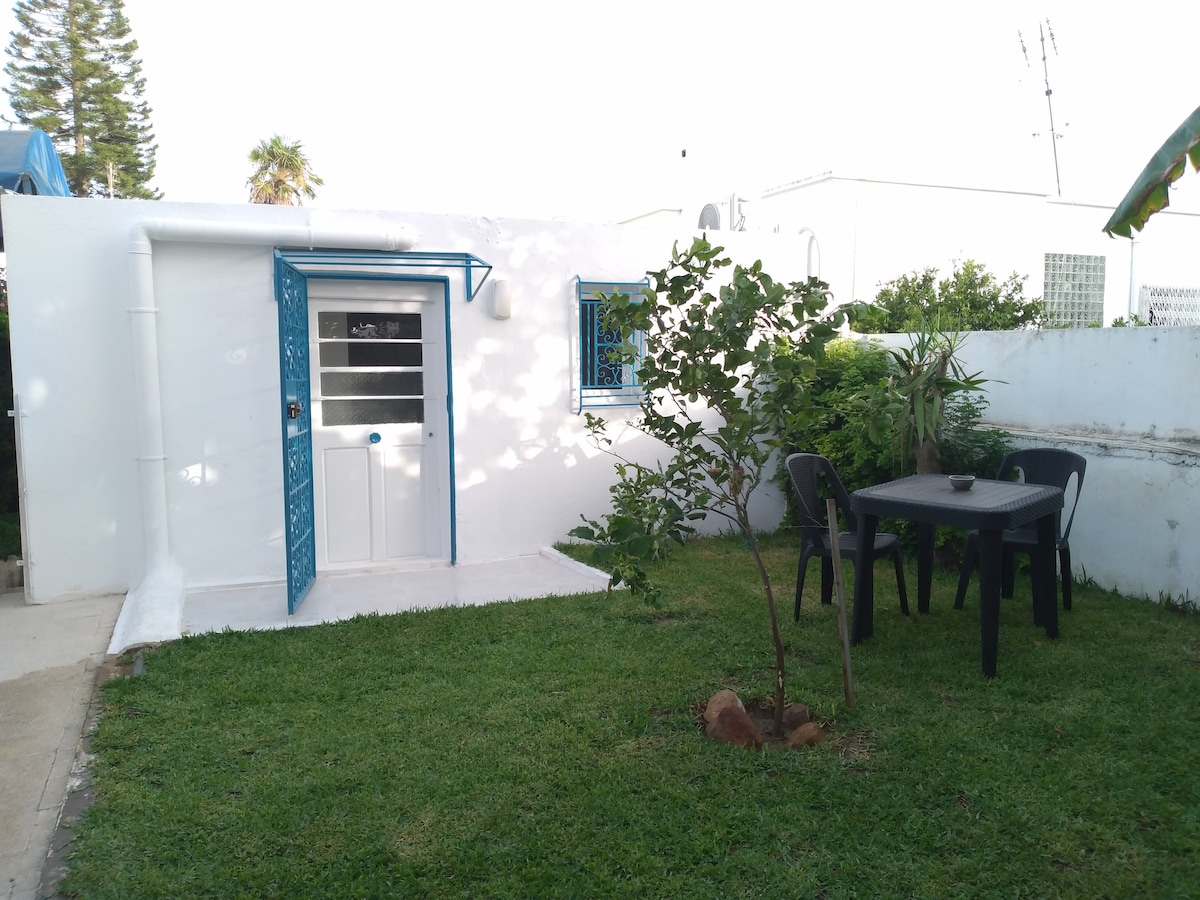 Studio indépendant dans beau quartier calme et sécure de la Marsa. Idéalement placé, il se situe à quelques minutes de la plage de la Marsa, et à moins de 2 km du centre de Sidi Bou Saïd. petits commerces à proximité : superette, restaurants, épiciers, boulangers, glaciers, pharmacie etc... Le studio donne sur le jardin et un espace exterieur aménagé. Il se compose d'une chambre climatisée (lit 160 x 190 cm) avec kitchenette, et d'une salle d'eau. Parking fermé et privatif à disposition