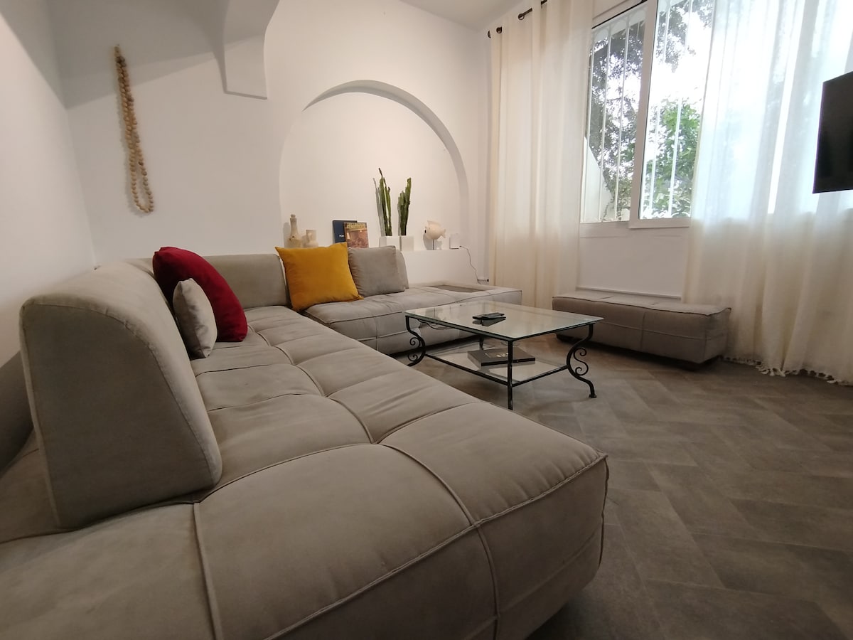 Enjoy a lovely family stay in this charming 3-bedroom home, perfect for creating lasting memories. Ideally located in a quiet residential area, just 10 minutes from the beach and near two horse riding clubs. Within 5 minutes: supermarket, laundry, pharmacy, cafés, and bus stop. Only 15 min from the airport and 25 min from Tunis and the Medina. Close to La Marsa, the blue village of Sidi Bou Said, and the ruins of Carthage