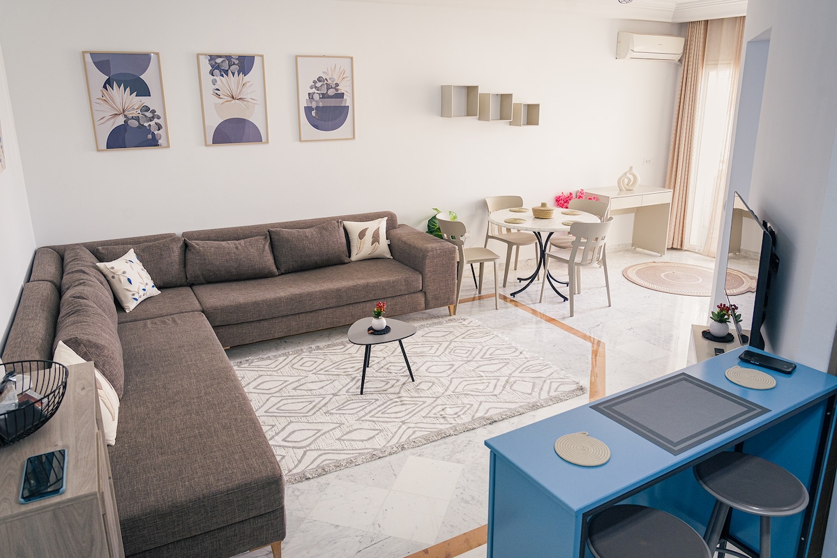 Bienvenue dans notre charmant appartement au rez-de-chaussée, mêlant décor méditerranéen et style contemporain, parfaitement situé et tres facile d’accès, entouré de cafés, restaurants et boutiques, a 30 secondes à pieds deTunisia Mall. Idéalement conçu pour 2 couples, il peut néanmoins accueillir jusqu’a 6 personnes avec son espace salon modulable. Architecture soignée, riche en équipements, avec une terrasse de 52 m², tout est pensé pour que vous vous sentiez chez vous :)