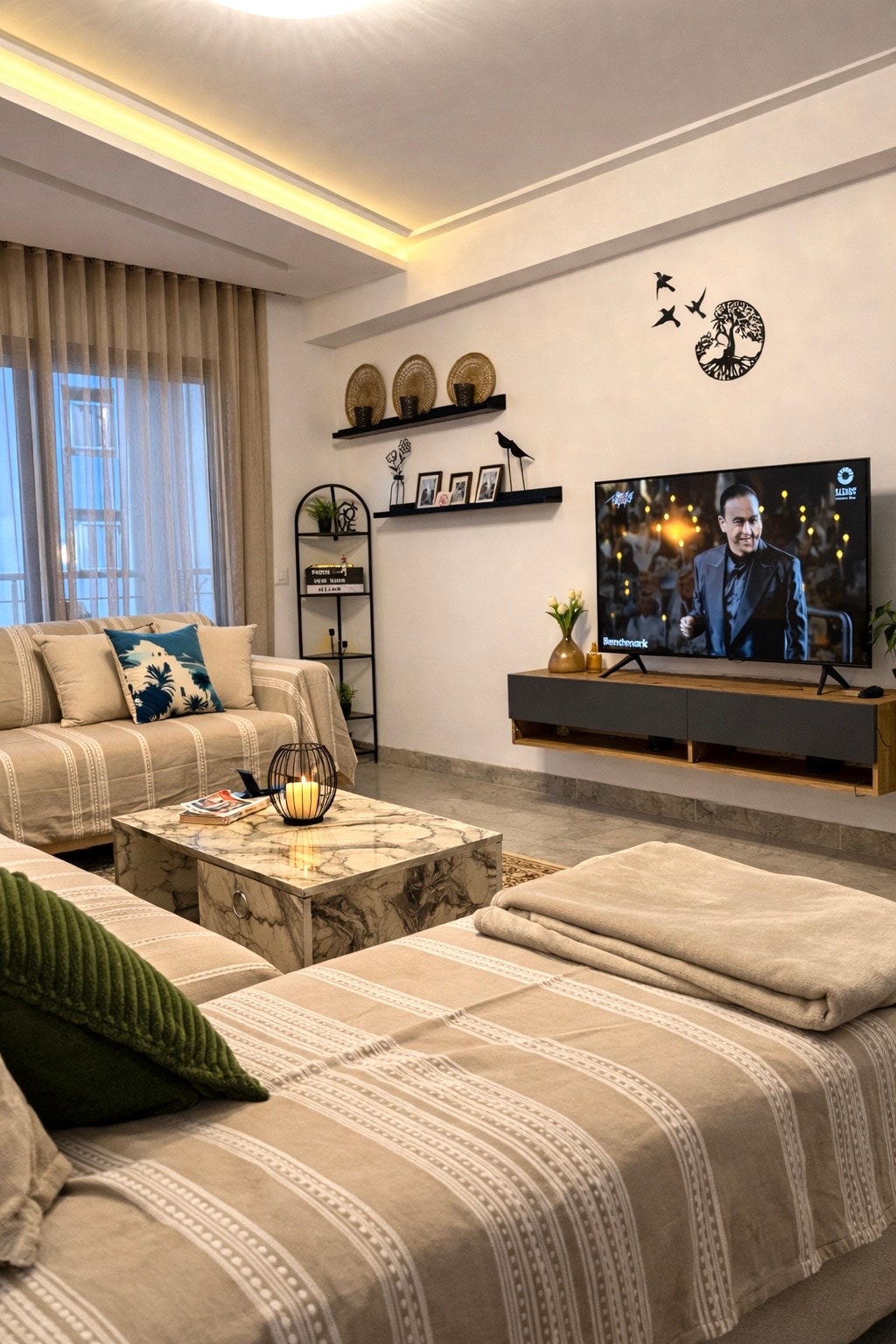 Un intérieur qui célèbre l’authenticité et qui permet d’avoir un espace de vie unique Un appart décoré avec des objets artisanaux qui racontent une histoire, chaque pièce artisanale contribue à l’originalité de notre espace. Appart situé aux Jardins de Carthage à 15mn de l’aéroport 5mn du lac 2 et du centre commercial Carrefour la Marsa, proche de toutes commodités, la Marsa, Carthage, la Goulette Appart dispose d’une place de parking au sous-sol, fibre optique, smart TV, un coin bureau