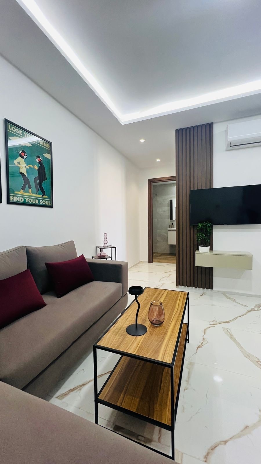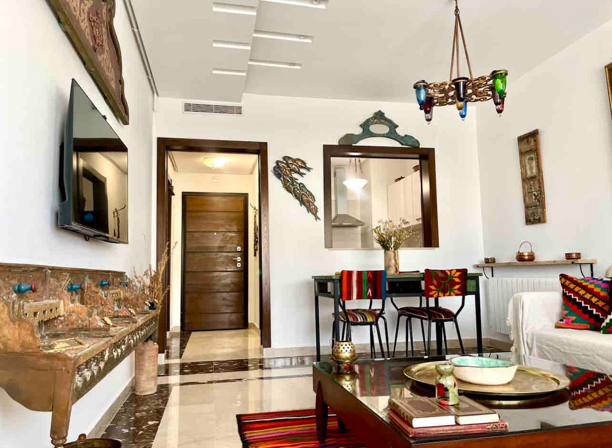 Un intérieur qui célèbre l’authenticité et qui permet d’avoir un espace de vie unique Un appart décoré avec des objets artisanaux qui racontent une histoire, chaque pièce artisanale contribue à l’originalité de notre espace. Appart situé aux Jardins de Carthage à 15mn de l’aéroport 5mn du lac 2 et du centre commercial Carrefour la Marsa, proche de toutes commodités, la Marsa, Carthage, la Goulette Appart dispose d’une place de parking au sous-sol, fibre optique, smart TV, un coin bureau