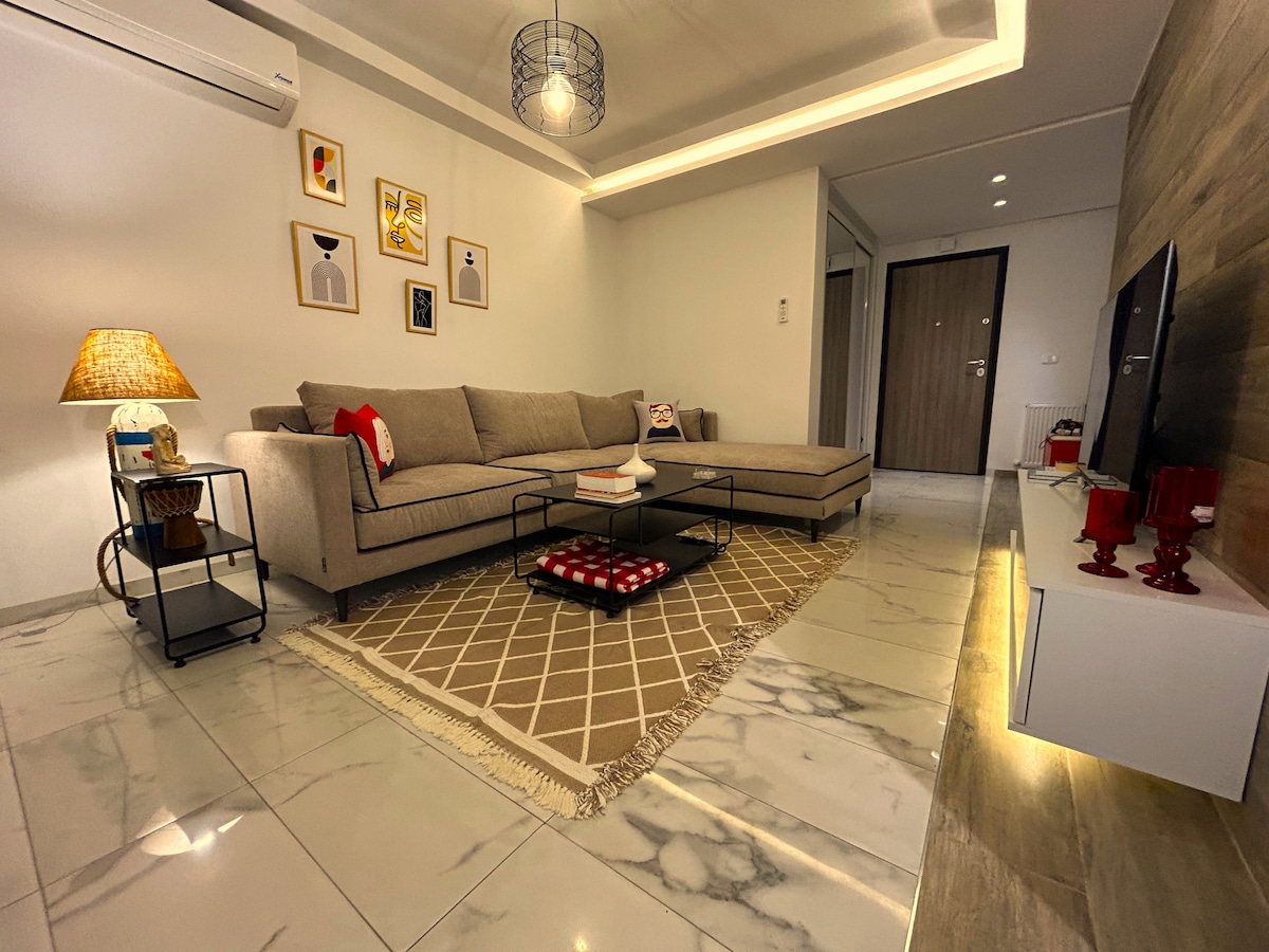 Relax in this quiet and elegant accommodation located in Ain Zaghouan Nord La Marsa. A beautiful, fully furnished apartment. Fully equipped kitchen open to the living room. Living room with 50-inch smart TV and Netflix subscription available. Spacious bedroom with a large queen size bed and large wall-mounted dressing room for more storage. A superb dressing table equipped with a pouf to make yourself look beautiful before heading out for the evening. An outdoor terrace that leaves you amazed