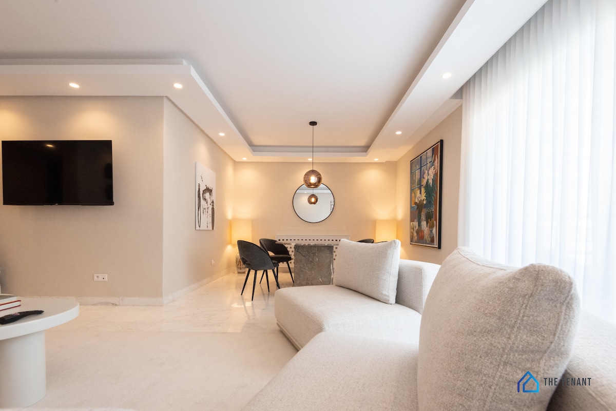 Experience luxury in this elegant one-bedroom apartment in Lac 2, Tunis. Located in a quiet, secure building with 24/7 concierge, this stylish space features handmade decor, marble floors, a sunny balcony, Smart TV, high-speed 100 Mbps Wi-Fi, a fully equipped open kitchen, and a large sofa that converts to a bed. Includes a work desk, washing machine, air conditioning, central heating, and private parking. Ideal for business, couples, or extended stays.