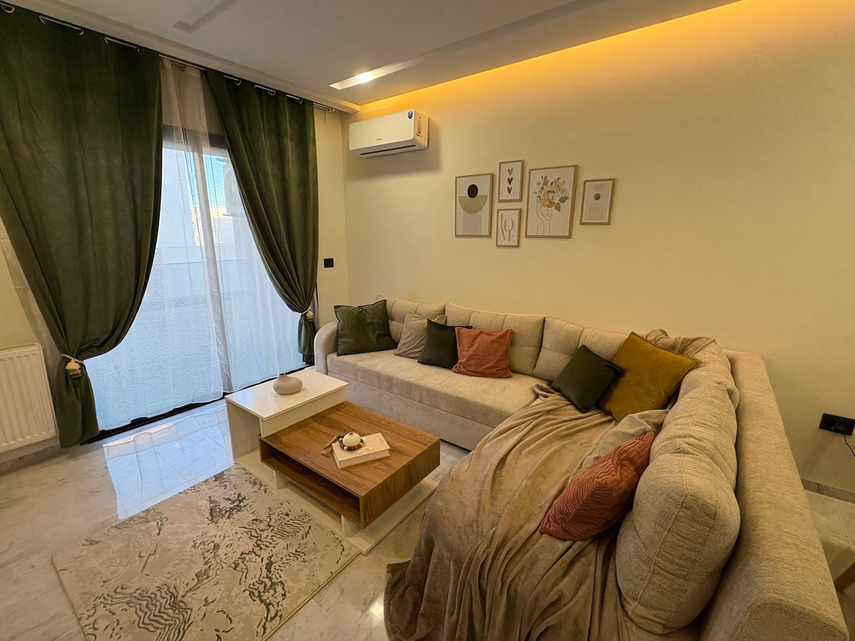 appart s+1 au 4ème étage avec 2 ascenseurs situé à mrezga entre hammamet- nabeul à proximité de toutes commodités ( restaurants/ cafés/ banques/ supérette/ plages / lounges ...) : Chambre à coucher spacieuse contenant 1 lit 2 places, un dressing. sale de bain. cuisine américaine bien équipée : four électrique, micro-onde , réfrigérateur, plaque, hotte, lave linge, éléments de rangement. salon. chauffage central et climatiseur.