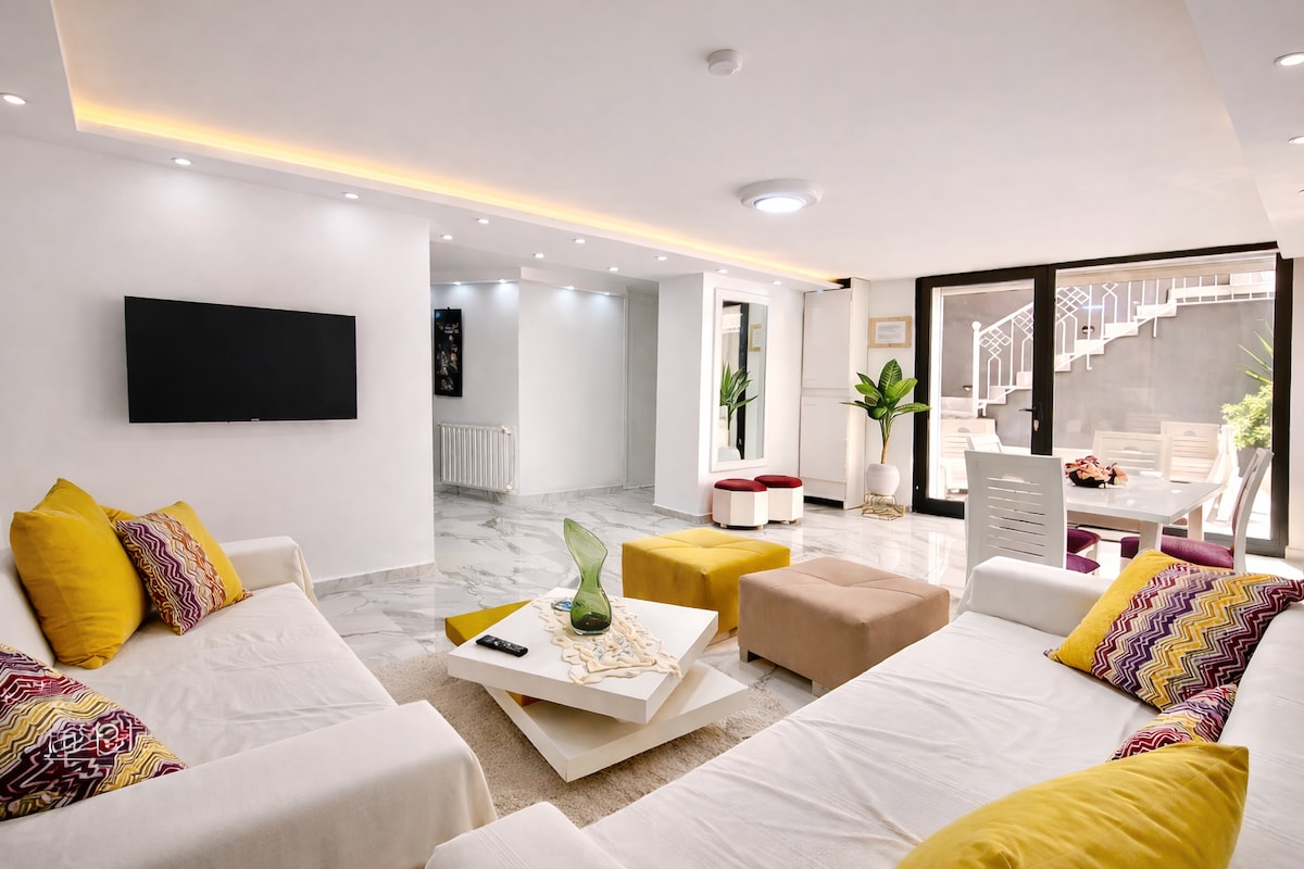 Novostar Apart is a new spacious (315 sq. m) modern apartment opened in 2022. It's a spacious single-level apartment on the top floor with a breathtaking view over the sea from large terraces. The apartment is a good choice for families or groups of friends. The apartment is equipped with sun loungers for comfortable sunbathing right on the terraces. The apartment is managed by professional hoteliers, so an excellent service, cleanliness and comfort are guaranteed.