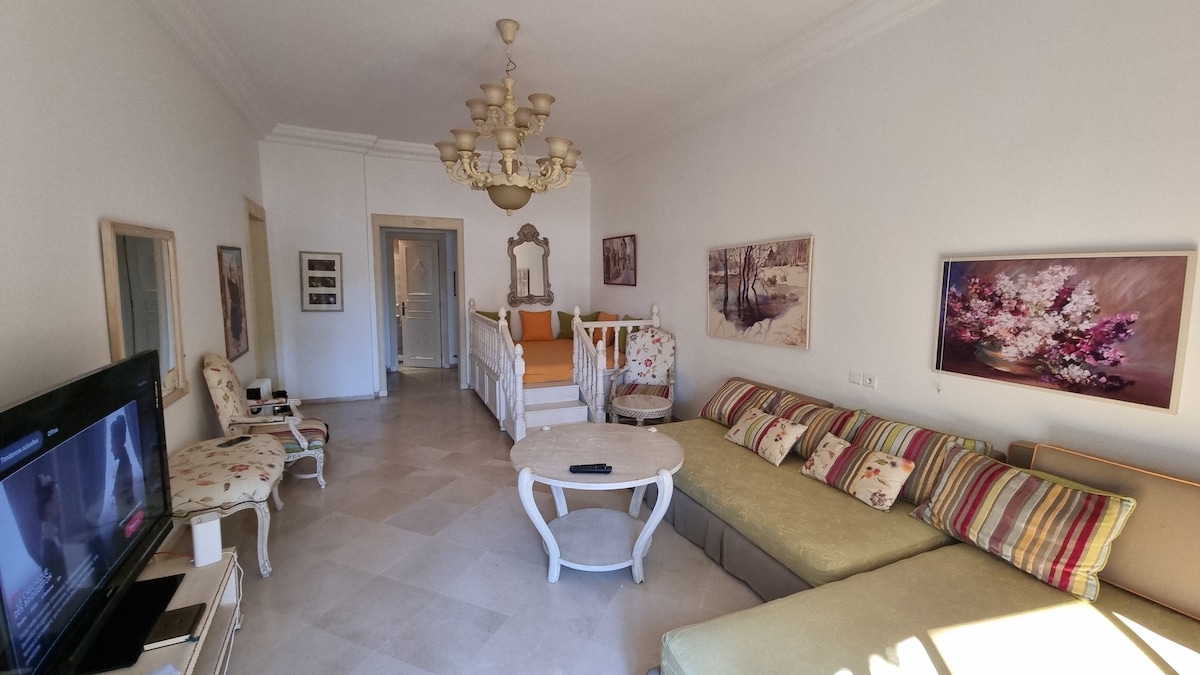 luxurious apartment in résidence Kanta with independent garden in a hotel Kanta located in the heart of the Sousse tourist area next to the sea, you have everything from the hotel swimming pool entertainment restaurant spa massage hairdresser store next to the port , NEXT to thé golf where there are all the lively restaurants everything is within walking distance excellent atmosphere . you will have free access to the swimming pool and the beach, also the hotel's night shows