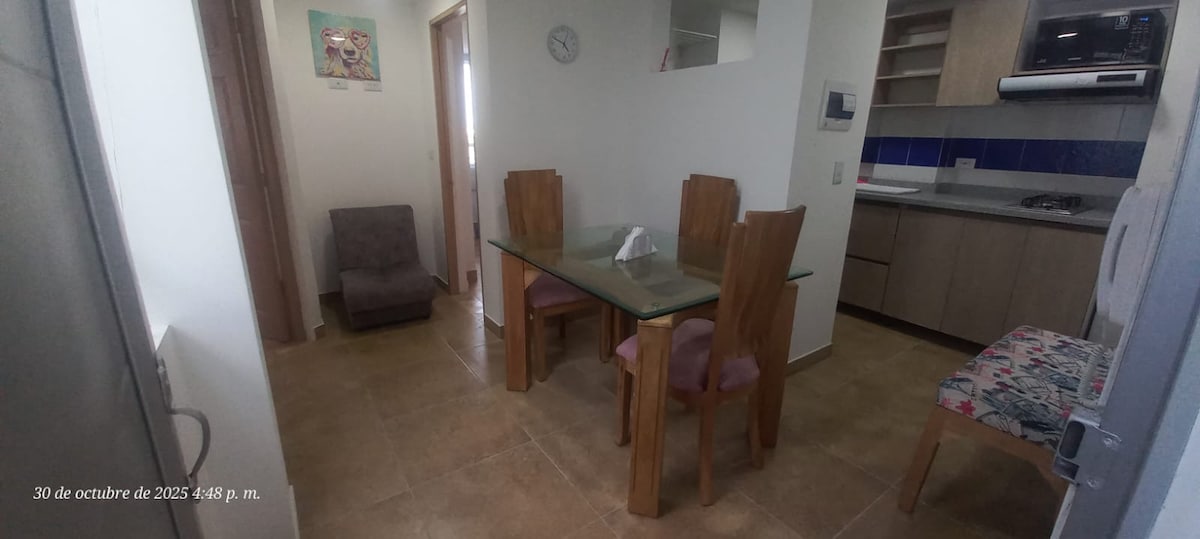 2 habitaciones con camas confortables, excelente iluminación natural. No cuenta con parqueadero. Baño moderno con ducha amplia. Cocina integral equipada con estufa de gas y utensilios de cocina. Lavadora, lavadero y tendedero retráctil. Sala-comedor con TV, barra americana y sofá cómodo. Cercano a los Centros Comerciales Viva y Unicentro, parques De las Aguas y Recreacional; a 15 minutos de la Plaza de Bolívar. Cerca a supermercado Ara y fácil encontrar cualquier tipo de comercio.