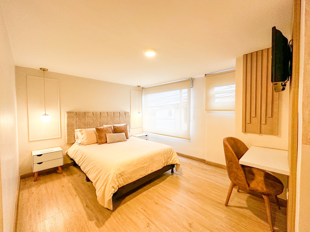 Descansa y relájate en este espacio tranquilo y elegante. Nuestra habitación está situada en el centro histórico de nuestra hermosa ciudad de Tunja. A tan solo 4 cuadras de la Plaza de Bolívar y a 1 cuadra del Parque Santander.