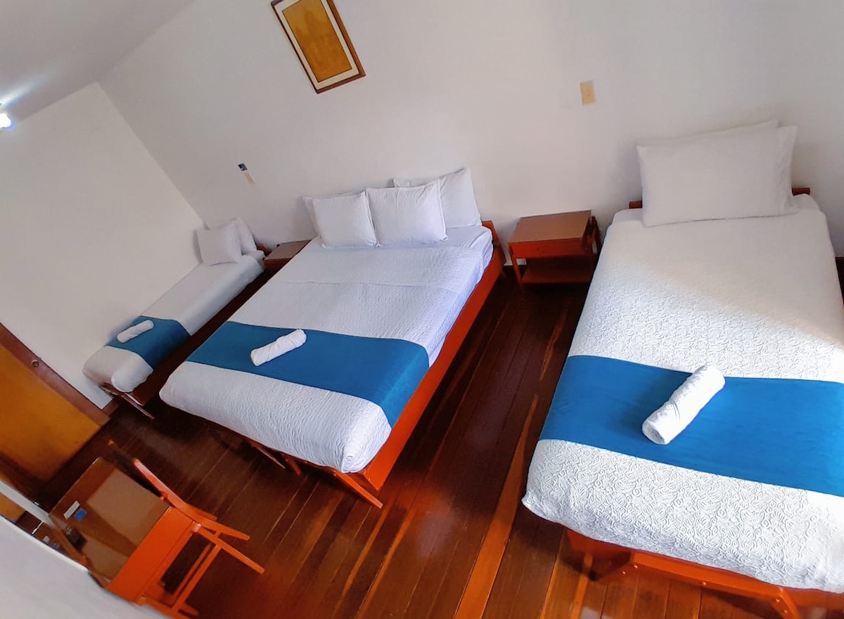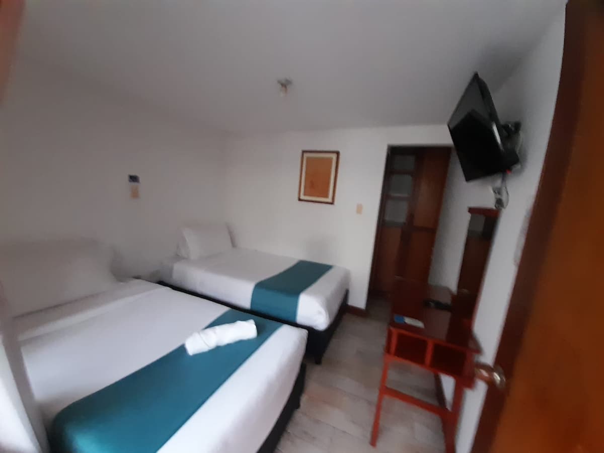 Habitación para 3 persona a tan solo media cuadra de la plaza de Bolívar Tunja Boyacá, en el centro de la ciudad a pasos de notarias, catedral, gobernación, lotería de Boyacá, alcaldía de Tunja, a solo 10 minutos del terminal de transportes, sector seguro, colonial y tranquilo, fácil acceder a transporte para ciudades como Villa de Leyva, Duitama, Paipa. La habitación cuenta con internet wifi, tv satelital, el hotel ofrece de cortesía desayuno americano, servicio de aseo todos los días