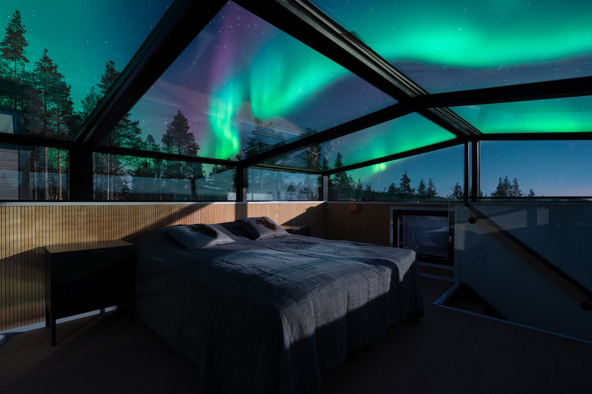 「极光景观」拉普兰和天际景观卧室,配备按摩浴缸
