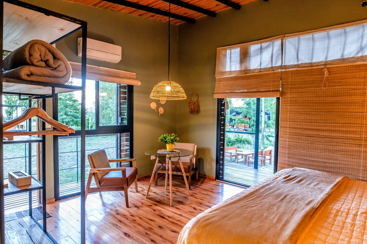 Rodéate de naturaleza y disfrutá uno de los parajes más hermosos del Valle de Uco . Complejo La HIJUELA te ofrece la comodidad y el confort de un hotel ,Pero con la magia de una cabaña en un bosque . El servicio es de alta categoría, por sus instalaciones únicas en el Manzano Histórico, contamos con sommier king size , baño zonificado con bañadera y cocina totalmente equipada, también podrás disfrutar de cocinar al aire libre , con instalación y mobiliario para exterior.