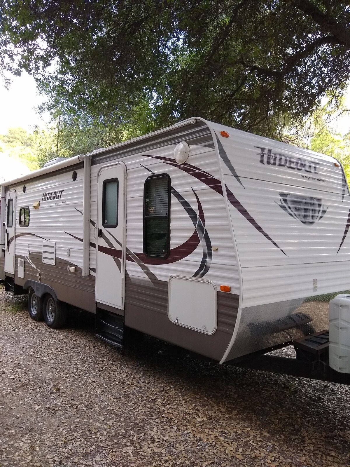 Cozy 22’ RV (a 25 year old Ragen Toy Hauler) on the grounds of Scottie's Workshop, motorcycle shop and campground—-close to lush lawns, fire pit and dining area, camp kitchen with adjacent private shower and toilet rooms. Older RV has Super comfy queen bunk plus two single beds which fold into couches; three burner propane stove and oven; kitchen sink; full size RV style bathroom with sink and shower; air conditioning. Free and easy parking. You can also pitch a tent on the lawn if you wish.